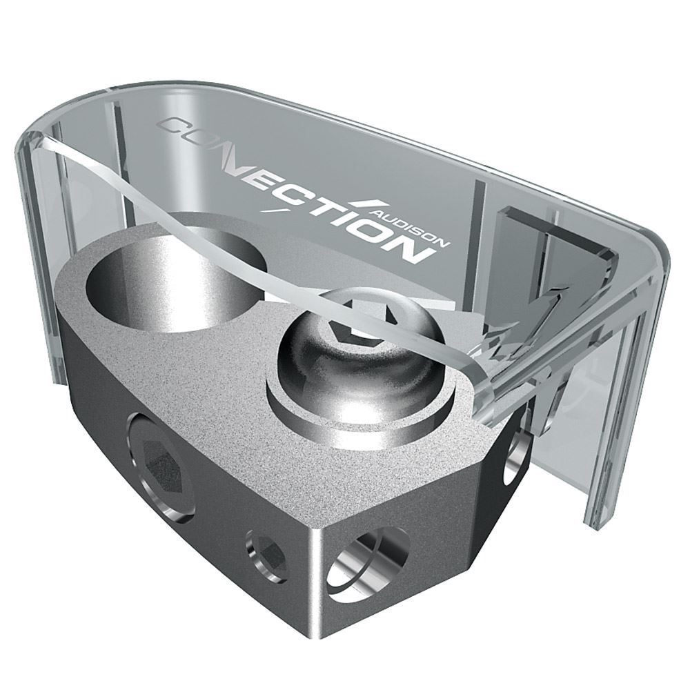 Polycarbonate casing, strong and scratch resistant. Separate positive and negative post designs for better fit. Wrap around “clamp” design for a tight, reliable connection. Ring terminal connection and 2 – 8 AWG outputs for flexible system design. SMBTM (Solid Machined Brass) construction for improved current transfer. Nickel satin finish for enhanced cosmetics.