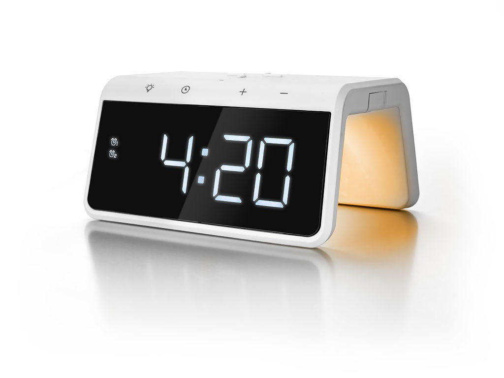 The Caliber HCG019QI/W is an alarm clock, bedside lamp, and cordless phone charger all in one. Very handy, because that is exactly what you need for your bedside table. The alarm clock supports wireless charging via Qi technology, so make sure your phone supports this too. The design of the HCG019QI/W is striking, but also very smart. Because of the 'arc shape' there is room for the light on the inside and you put your phone on top to charge it. You can adjust the light in different colors. The HCG019QI/W has a snooze function so you can turn around in the morning. You will be woken up by a buzzer sound. The time display works with an automatic dimming function and can also be adjusted manually to make watching easier. For example, the light becomes a little less bright at 6 o'clock in the evening, is at its softest at midnight and goes bright again at 7 o'clock in the morning.